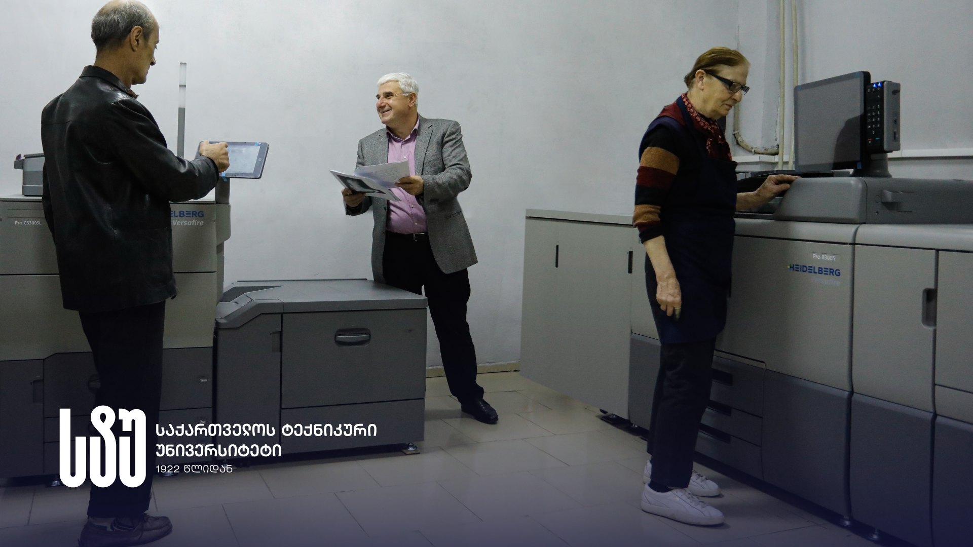 „იაპონური წარმოების ციფრული ფერადი საბეჭდი მანქანა – Roco-Heidelberg Versafire Pro C5300SL, ციფრული შავ-თეთრი საბეჭდი მანქანა – Roco-Heidelberg Versafire Pro 8300S, თერმოამკინძავი HORIZON BQ-270, გერმანული წარმოების ქაღალდის საჭრელი POLAR Mohr – 92 EM – ეს არის დანადგარები, რომელიც რექტორის, აკადემიკოს დავით გურგენიძის ინიციატივით, უშუალო ჩართულობითა და მხარდაჭერით შეიძინა საუნივერსიტეტო სტამბამ. ასეთი მასშტაბური გადაიარაღება ჩვენი სტამბის ისტორიაში პირველად მოხდა.