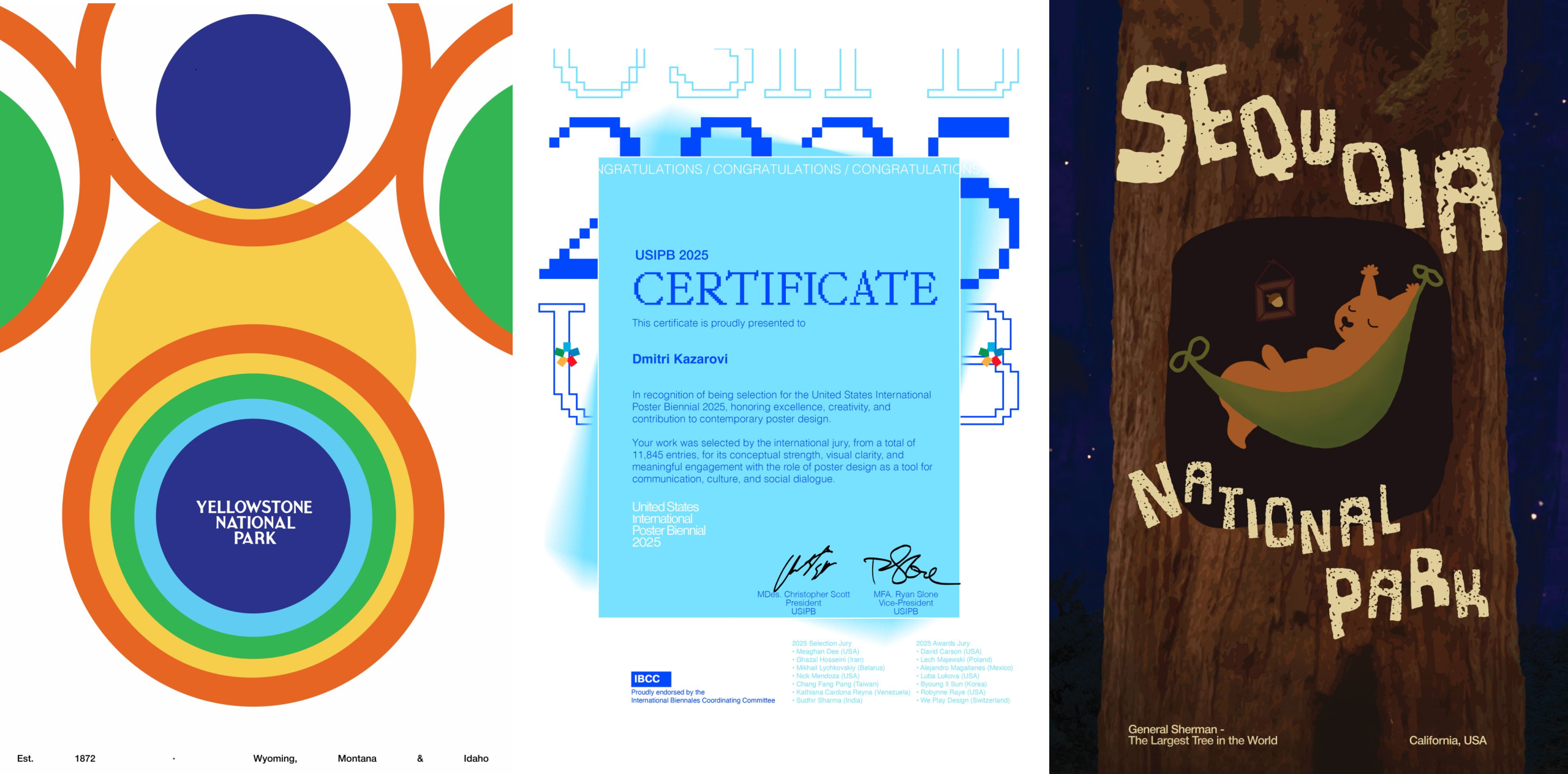 აშშ-ის საერთაშორისო პოსტერის ბიენალეს ორგანიზატორთა ინფორმაციით, დიმიტრი კაზაროვის ავტორობით შესრულებული პოსტერები – „გეოთერმული აბსტრაქცია“ და „შერმანი – კეთილი გოლიათი“ – ამჟამად ამერიკის შეერთებული შტატების მასშტაბით არის გამოფენილი, ასევე წარმოდგენილია USIPB-ის ვებგვერდზე, D კატეგორიაში – „ეროვნული პარკები“, ბმულით.