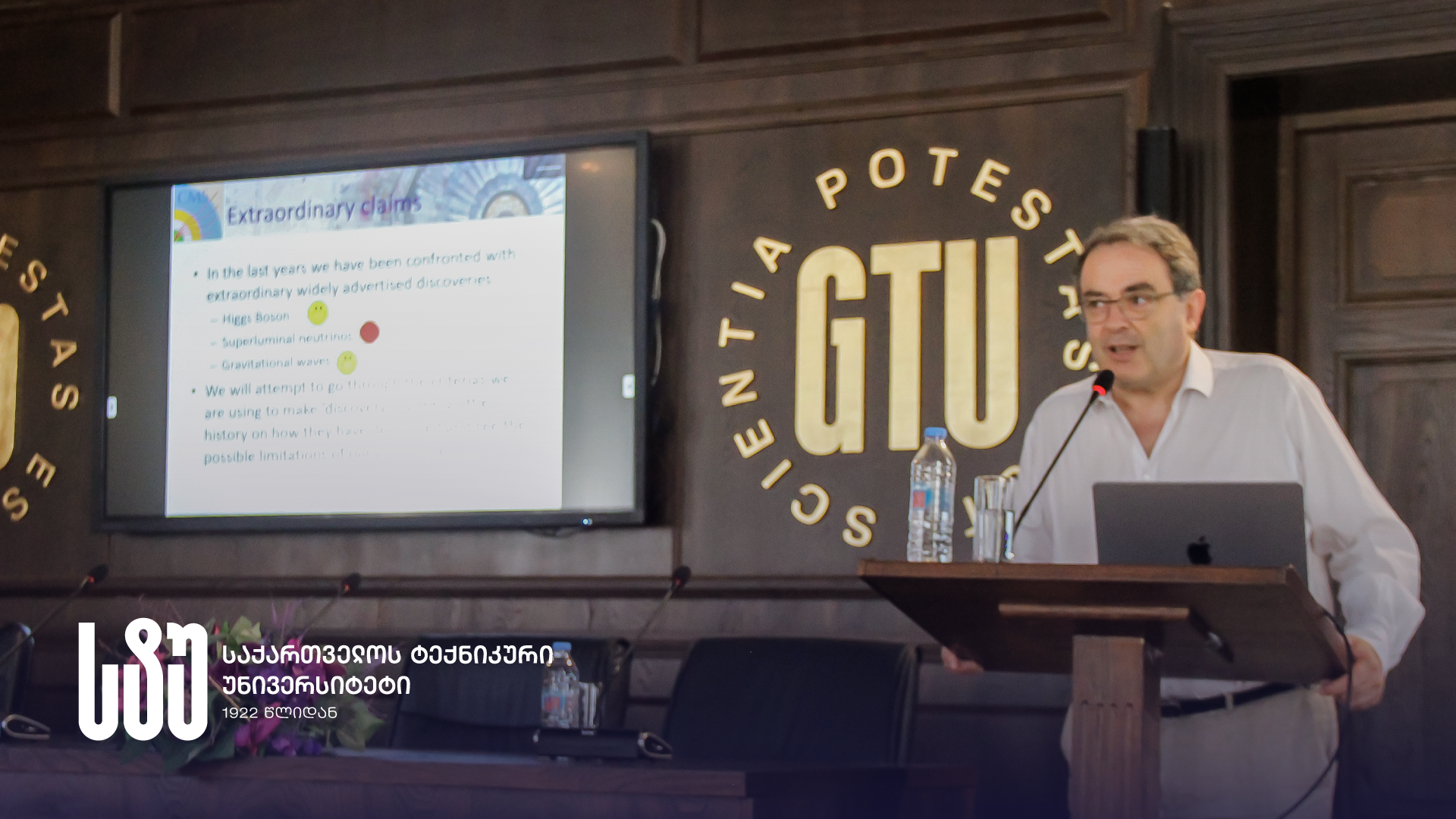 საჯარო ლექციაზე CERN-ის მეცნიერმა სტუ-ის სტუდენტებსა და პროფესორ-მასწავლებელებს გაუზიარა მაგალითები HEP-ის ისტორიიდან, ესაუბრა მნიშვნელოვანი აღმოჩენების, მონაცემების ალბათობის, „5 სიგმის“ კრიტერიუმისა და მისი თანამედროვე გამოყენების, სისტემური შეცდომების, გარკვეული მოდელების არაადეკვატურობის, მეცნიერებაში ქვეცნობიერი „მოლოდინის“, თეორიისა და პრაქტიკის ურთიერთკვეთის, ჯერ კიდევ უპასუხოდ დარჩენილი გლობალური შეკითხვებისა და მომავალი სამეცნიერო გეგმების შესახებ.