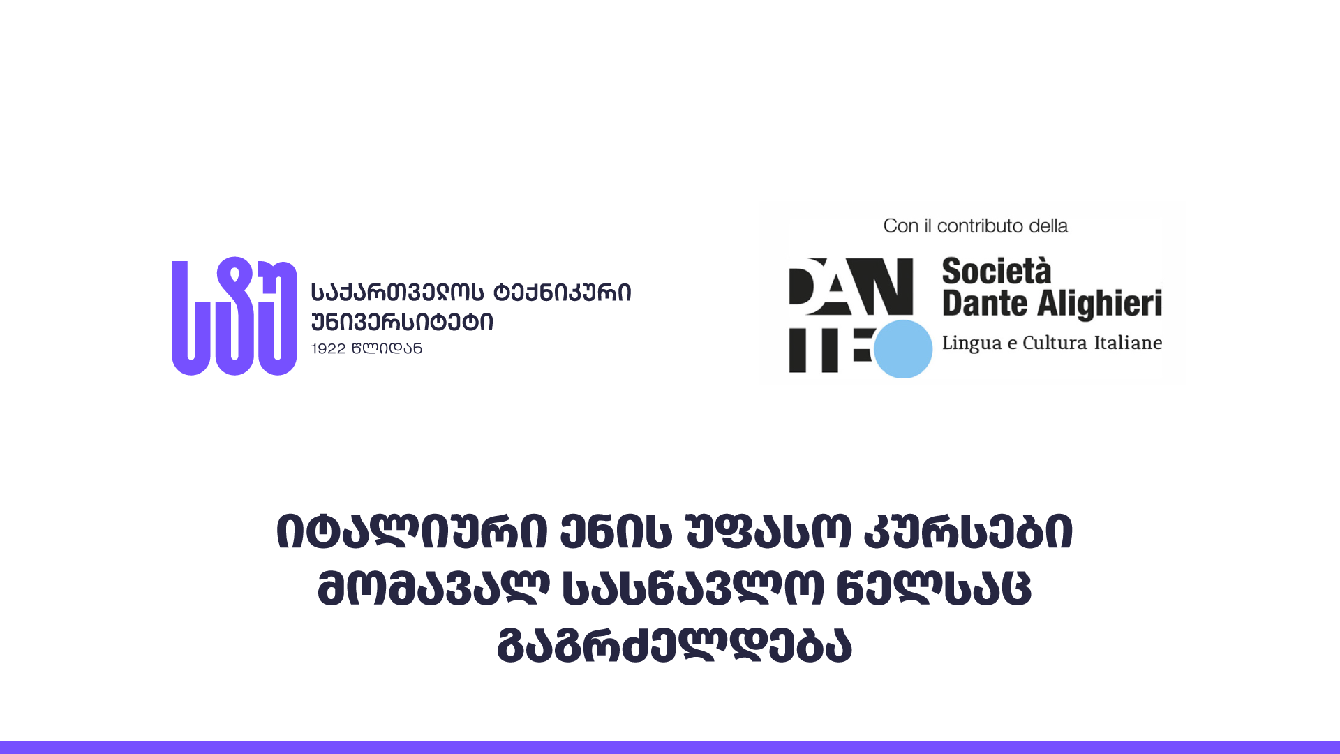 საქართველოს ტექნიკური უნივერსიტეტის ბაზაზე მოქმედი „დანტეს კაბინეტი“, დანტე ალიგიერის საზოგადოების საერთაშორისო ქსელის რომის სათავო ოფისის დაფინანსებით, უნივერსიტეტის სტუდენტებსა და თანამშრომლებს სთავაზობს უნიკალურ შესაძლებლობას, 2024-2025 სასწავლო წელს უფასოდ შეისწავლონ იტალიური ენა.